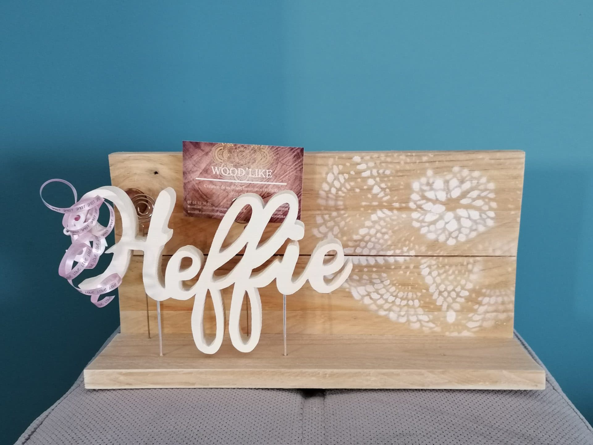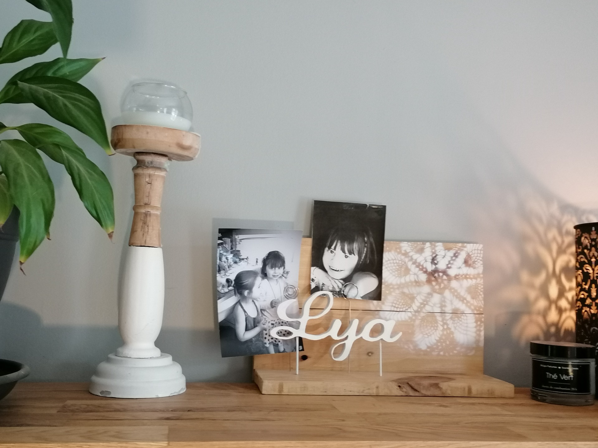 Porte photo en bois avec pochoir mandala blanc, découpe de bois prénom blanc (personnalisé) et deux tiges porte photo